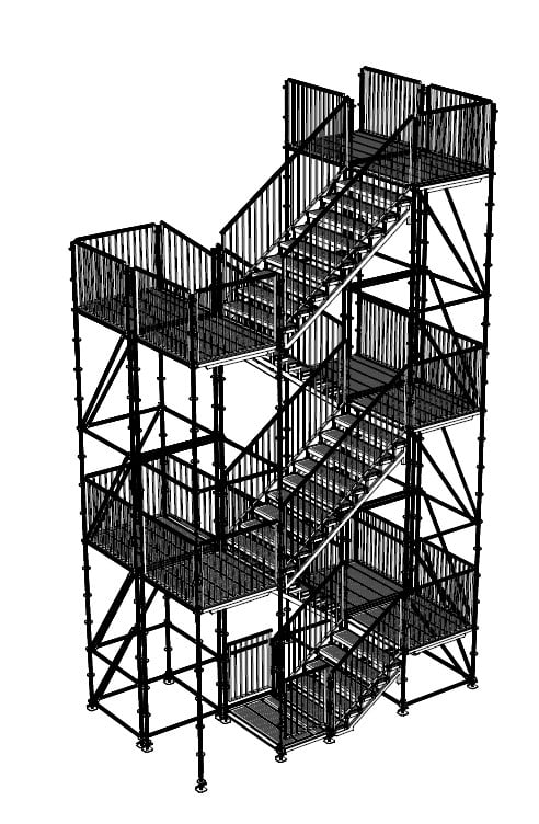 Profesionální lešení uzpůsobené pro instalaci v místech s výškovými rozdíly - použití například jako nouzové schodiště, pracovní schodiště s několika výstupy, také jako dočasné schodiště pro veřejnost, eventové akce atd.